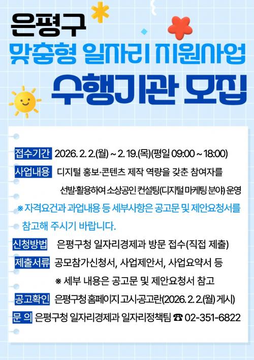 [½Åµ¿¾Æ¹æ¼Û ÀºÆò±¸=À̽ŵ¿±âÀÚ] ¼­¿ï ÀºÆò±¸´Â ¸ÂÃãÇü ÀÏÀÚ¸® âÃâ°ú Áö¿ª ¼Ò»ó°øÀÎÀÇ µðÁöÅÐ °æÀï·Â °­È­¸¦ À§ÇØ ¡®2026³â ÁßÀå³â »õÃâ¹ß ÅðÁ÷ÀÚ µî ¸ÂÃãÇü ÀÏÀÚ¸® Áö¿ø»ç¾÷¡¯ ¼öÇà±â°üÀ» °ø°³ ¸ðÁýÇÑ´Ù°í ¹àÇû´Ù. À̹ø »ç¾÷Àº µðÁöÅÐ È«º¸¿Í ÄÜÅÙÃ÷ Á¦ÀÛ ¿ª·®À» °®¡¦