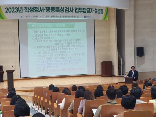 31ÀÏ ½Ã±³À°Ã»¿¡ µû¸£¸é À̹ø ¼³¸íȸ¿¡´Â °ü³» ÃÊ¡¤Áß¡¤°í ¹× Àü¹®±â°ü ÇлýÁ¤¼¡¤ÇൿƯ¼º°Ë»ç ¾÷¹«´ã´çÀÚ 340¿© ¸íÀÌ Âü¼®Çß´Ù. 2023³â ÇлýÁ¤¼¡¤ÇൿƯ¼º°Ë»ç ¾÷¹«ÀÇ Àü¹ÝÀûÀÎ È帧°ú °Ë»ç ÀÏÁ¤ µî ÁÖ¿ä º¯°æ»çÇ×, ³ªÀ̽º ½Ã½ºÅÛ »ç¿ë ¹æ¹ý¿¡ ´ëÇÑ ³»¿ëÀ¸·Î ÁøÇàµÆ´Ù.