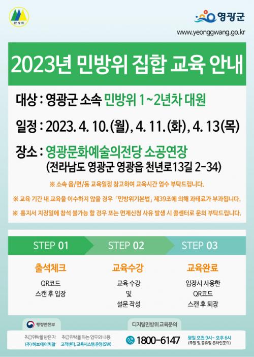 »ó¹Ý±â ÁýÇÕ±³À°Àº ¿µ±¤¹®È¿¹¼úÀÇÀü´ç ¼Ò°ø¿¬Àå¿¡¼ 4. 10.(¿ù), 4. 11.(È), 4. 13.(¸ñ) 3Àϰ£ 1ÀÏ 2ȸ ±³À°ÀÌ ½Ç½ÃµÈ´Ù. ¡ã¿ÀÀü ±³À°Àº 09:00¡13:00(4½Ã°£) ¡ã¿ÀÈı³À°Àº 14:00¡18:00(4½Ã°£)±îÁöÀ̸ç, ÀÚ¼¼ÇÑ ±³À°ÀÏÁ¤°ú Àå¼Ò´Â ±¹¹ÎÀç³¾ÈÀüÆ÷ÅÐ ¶Ç´Â ¾ÈÀüµðµõµ¹ ¾Û¿¡¼ È®ÀÎÇÒ ¼ö ÀÖ°í ½ÅºÐÁõÀ» ÁöÂüÇØ Âü¼®ÇÏ¸é µÈ´Ù.