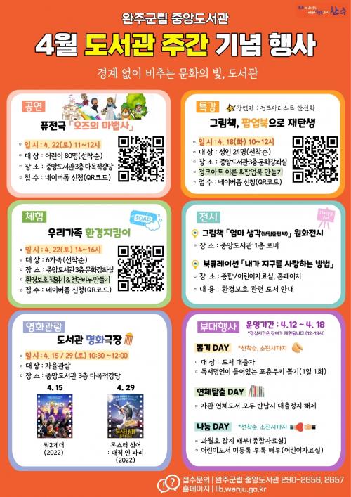 ¿ÏÁÖ±º Áß¾Óµµ¼°üÀº ¡ã¶óÀÌ¸Õ ÇÁ·©Å© ¹Ù¿òÀÇ <¿ÀÁîÀÇ ¸¶¹ý»ç>¸¦ °¢»öÇÑ Ç»Àü±Ø(4.22.) ¡ã±×¸²Ã¥À» ÆË¾÷ºÏÀ¸·Î ¸¸µé±â üÇè Æ¯°(4.18.) ¡ãȯ°æº¸È£¸¦ À§ÇÑ Ãµ¿¬ ºñ´© ¸¸µé±â °¡Á· üÇè(4.22.) ¡ã±×¸²Ã¥ <¾ö¸¶ »ý°¢> ¿øÈÀü½Ã µîÀ» ½Ç½ÃÇÑ´Ù.