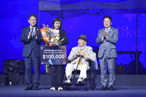 [½Åµ¿¾Æ¹æ¼Û=³²À¯¼®±âÀÚ]°±âÁ¤ ±¤ÁÖ±¤¿ª½ÃÀåÀÌ 6ÀÏ ¿ÀÈÄ ºÏ±¸ ±¤ÁÖºñ¿£³¯·¹ Àü½Ã°ü ¾Õ ±¤Àå¿¡¼ ¿¸° 'Á¦14ȸ ±¤ÁÖºñ¿£³¯·¹ °³¸·½Ä'¿¡ Âü¼®ÇØ ¹Ú¼º¸ ¿¹¼ú»ó ù ¼ö»óÀÚÀÎ ¾öÁ¤¼ø ÀÛ°¡¿¡°Ô ½Ã»óÇÑ µÚ ±â³äÃÔ¿µÀ» Çϰí ÀÖ´Ù.
