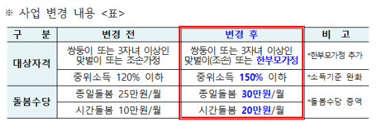 ¸ÕÀú Áö¿ø´ë»óÀ» ÇѺθð°¡Á¤±îÁö Æ÷ÇÔÇØ ¾çÀ°°ú µ¹º½¿¡ »ó´ëÀûÀ¸·Î Ãë¾àÇÑ °¡Á¤±îÁö ÃÎÃÎÇÏ°Ô º¸È£ÇÑ´Ù. ¶Ç ¼Òµæ±âÁØÀº ÁßÀ§¼Òµæ 120% ÀÌÇÏ¿¡¼ 150% ÀÌÇϱîÁö »óÇâ Á¶Á¤Çß´Ù.
