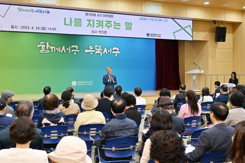 [½Åµ¿¾Æ¹æ¼Û=³²À¯¼®±âÀÚ]±¤ÁÖ ¼­±¸(±¸Ã»Àå ±èÀ̰­)´Â 24ÀÏ ¿ÀÈÄ Ã»»ç 2Ãþ µéºÒȦ¿¡¼­ ¼­±¸¹Î 100¿©¸íÀÌ Âü¼®ÇÑ °¡¿îµ¥ ¹ÚÁø¿µ °ø°¨ Ä¿¹Â´ÏÄÉÀÌ¼Ç ¿¬±¸¼Ò ´ëÇ¥¸¦ ÃÊÃ»ÇØ ¡®³ª¸¦ ÁöÄÑÁÖ´Â ¸»¡¯À̶ó´Â ÁÖÁ¦·Î Á¦105ȸ ¼­±¸ ¾ÆÄ«µ¥¹Ì¸¦ °³ÃÖÇß´Ù.