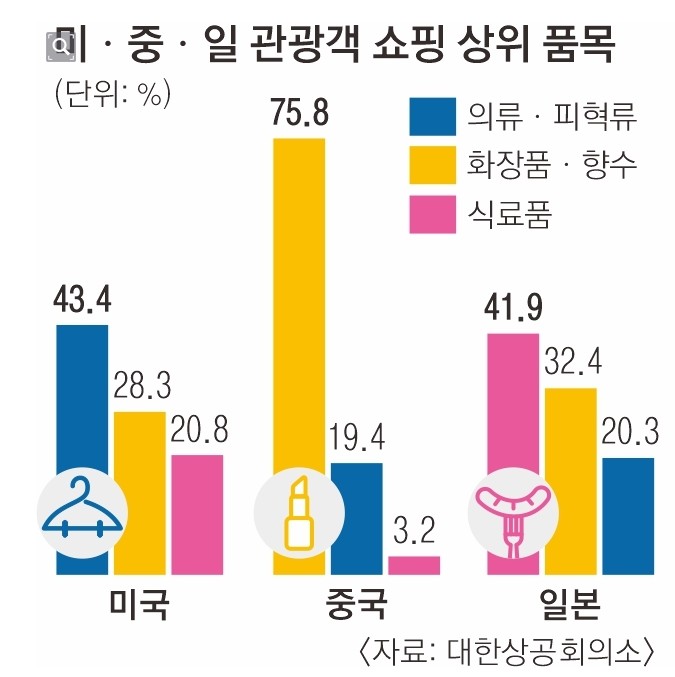 ÀÀ´äÀÚ ¼ö »óÀ§ 3±¹ÀÎ ¹ÌÁßÀÏ °ü±¤°´µéÀÇ ¼±È£ ǰ¸ñÀº, Áß±¹Àº ÈÀåǰ°ú Çâ¼ö¿¡ 76%¸¦ ÁöÃâÇßÀ¸¸ç, ÀϺ»Àº ½Ä·áǰ¿¡ 41%, ¹Ì±¹Àº ÀÇ·ù¿Í ÇÇÇõ·ù¿¡ 43%°¡ Áö°©À» ¿¬ °ÍÀ¸·Î ³ªÅ¸³ª¸ç, Áß±¹ °ü±¤°´µéÀ» ¸ÂÀ¸·Á´Â ¸íµ¿ µî °ü±¤¸í¼Ò´Â ±â´ë°¨À» ¼û±âÁö ¾Ê°í ÀÖ´Ù°í ÇÑ´Ù.