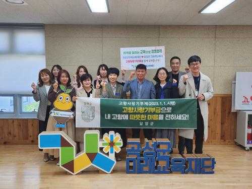 ´ã¾ç±º ÇàÁ¤°úÀå°ú °î¼º±º ¹Ì·¡±³À°Àç´Ü º»ºÎÀåÀº Á÷¿øµé°ú ÇѸ¶À½ ÇѶæÀ¸·Î µÎ Áö¿ªÀÇ ¹ßÀüÀ» ÀÀ¿øÇÏ¸ç ¾÷¹« ±³·ù ¹× Çù·Â °ü°è ÁõÁø°ú ±âºÎ¹®È­ Ȱ¼ºÈ­¸¦ À§ÇØ °íÇâ»ç¶û ±âºÎ±ÝÀ» »óÈ£ ±âºÎÇÏ¸ç ±âºÎ ¸±·¹ÀÌ ºÐÀ§±â¸¦ Á¶¼ºÇß´Ù.