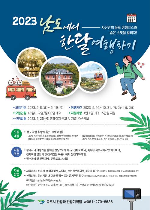 ¼±Á¤µÈ Âü°¡ÀÚ´Â Àü³² 22°³ ½Ã¡¤±º Àüü¸¦ ¿©ÇàÇÒ ¼ö ÀÖÁö¸¸ ¼÷¹ÚÀº ¸ñÆ÷¿¡¼¸¸ ÇØ¾ßÇϸç, Àüü ¿©Çà ÀÏÁ¤ÀÇ 50% ÀÌ»óÀ» ¸ñÆ÷¿¡¼ ÁøÇàÇØ¾ß ÇÑ´Ù.
