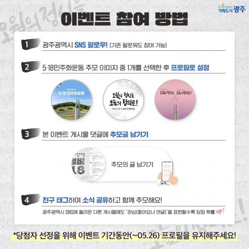 ¿À´Â 25ÀϱîÁö ÁøÇàµÇ´Â ¡®¸®¸â¹ö 5¡¤18¡¯Àº °³ÀÎ ÀνºÅ¸±×·¥À̳ª ÆäÀ̽ººÏÀÇ ÇÁ·ÎÇÊ »çÁøÀ» Á¦½ÃµÈ 5¡¤18 °ü·Ã À̹ÌÁö 3°¡Áö °¡¿îµ¥ Çϳª·Î º¯°æÇϰí ÇÁ·ÎÇÊ ÀÎÁõ¼¦°ú ÇÔ²² Ã߸ð ´ñ±ÛÀ» ÀÛ¼ºÇÏ¸é µÈ´Ù.