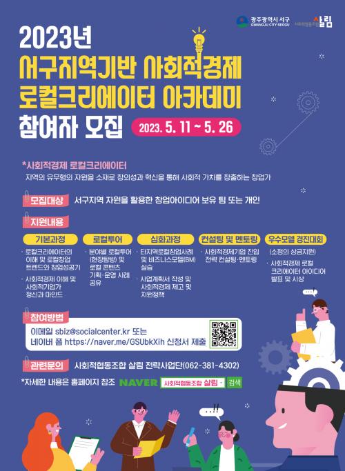 ¼±¸´Â ¸¶À»°øµ¿Ã¼, û³â, °æ·Â´ÜÀý¿©¼º, ÁßÀå³â µî »çȸÀû±â¾÷°¡¸¦ ¹ß±¼Çϰí, Áö¿ªÀÇ ´Ù¾çÇÑ ¹®È, ¿¹¼ú, ÀÚ¿ø, Ư¼º µî¿¡ âÀÇÀûÀÎ ¾ÆÀ̵ð¾î¸¦ Á¢¸ñ½ÃÄÑ »çȸÀû °¡Ä¡¸¦ âÃâÇÏ´Â »çȸÀû°æÁ¦ ·ÎÄÃÅ©¸®¿¡ÀÌÅ͸¦ À°¼ºÇϱâ À§ÇØ 6ºÎÅÍ 7¿ù±îÁö À̹ø ¾ÆÄ«µ¥¹Ì¸¦ ¿î¿µÇÒ °èȹÀÌ´Ù.