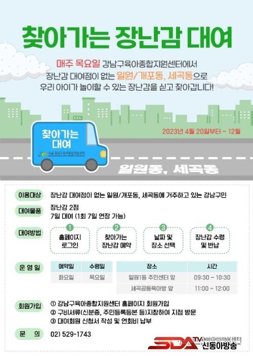 ³¯Â¥¿Í Àå¼Ò¸¦ ¼±ÅÃÇØ ¿¹¾àÇϸé ÀÏ¿ø1µ¿Áֹμ¾ÅÍ¿Í ¼¼°îµ¿Áֹμ¾ÅÍ ¿· °øµ¿À°¾Æ¹æ 2°³¼Ò·Î Àå³°¨À» ¹è´ÞÇØÁØ´Ù. ¿î¿µ½Ã°£Àº ¸ÅÁÖ ¸ñ¿äÀÏ ÀÏ¿ø1µ¿ 09:30~10:30, ¼¼°îµ¿ 11:00~12:00À¸·Î, ½Ã°£¿¡ ¸ÂÃç Àå³°¨À» ¼ö·ÉÇϰí ÀÌ¿ë ÈÄ À̰÷À¸·Î ¹Ý³³ÇÏ¸é µÈ´Ù. 1Àδç Àå³°¨ 2Á¾À» 7Àϰ£ ´ë¿©ÇÒ ¼ö ÀÖ°í, 1ȸ¿¡ ÇÑÇØ 7ÀÏ ÀÌ¿ë ¿¬ÀåÀ» ÇÒ ¼ö ÀÖ´Ù. ÀÚ¼¼ÇÑ ÀÌ¿ë ¹æ¹ýÀº °³²±¸À°¾ÆÁ¾ÇÕÁö¿ø¼¾ÅÍ È¨ÆäÀÌÁö(www.gncare.go.kr) ¹× ÀüÈ(02-529-1743)·Î ¹®ÀÇÇÏ¸é µÈ´Ù.