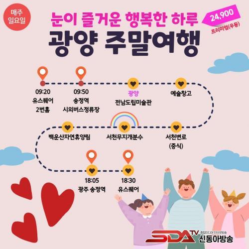 ±¤¾çÁÖ¸»¿©ÇàÀº ¸ÅÁÖ ÀÏ¿äÀÏ ±¤ÁÖ À¯½ºÄù¾î(9½Ã20ºÐ)¸¦ Ãâ¹ßÇØ ±¤ÁÖ¼ÛÁ¤¿ª(9½Ã50ºÐ)À» °æÀ¯, ±¤¾ç ¿øµµ½ÉÀÇ Àü³²µµ¸³¹Ì¼ú°ü, ±¤¾ç¿¹¼úâ°í µîÀ» °ü¶÷ÇÑ´Ù.