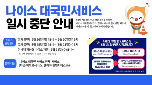 À̹ø ÀϽà Áß´ÜÀº ±³À°ºÎ¿¡¼ ±³À°ÇàÁ¤¾÷¹« È¿À²¼º Çâ»ó ¹× ±³À°°ü·Ã ´ë±¹¹Î¼ºñ½º ÆíÀǼº °È¸¦ À§ÇØ 4¼¼´ë Áö´ÉÇü ³ªÀ̽º ÀüȯÀ» ÁغñÇÏ´Â °³Æí ÀÛ¾÷À» ÇÏ´Â µ¥ µû¸¥ °ÍÀÌ´Ù.