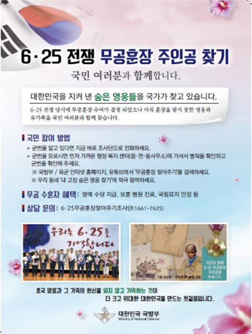 ¡®³» °íÀå ¿µ¿õã±â Ä·ÆäÀΡ¯Àº 6¡¤25ÀüÀï ´ç½Ã ÈÆÀå ¼ö¿©°¡ °áÁ¤µÆÀ¸³ª, ¾ÆÁ÷ ÈÆÀåÀ» ¹ÞÁö ¸øÇÑ ¹«°ø¼öÈÆÀÚ ¶Ç´Â À¯Á·À» ã¾Æ ÈÆÀåÀ» ¼ö¿©ÇÔÀ¸·Î½á È£±¹¿µ¿õÀÇ °øÈÆÀ» ±â¸®°í ±¹¹ÎÀÇ ¾Ö±¹Á¤½ÅÀ» ±â¸£°íÀÚ À°±ºº»ºÎ¿¡¼ ÃßÁøÇϰí ÀÖ´Â »ç¾÷ÀÌ´Ù.