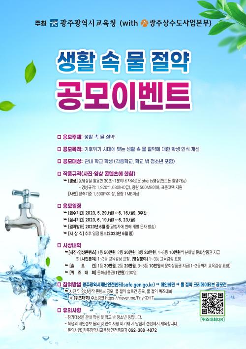 31ÀÏ ½Ã±³À°Ã»¿¡ µû¸£¸é À̹ø °ø¸ðÀüÀº ±¤ÁÖ»ó¼öµµ»ç¾÷º»ºÎ¿Í Çùµ¿À¸·Î ÁøÇàÇÑ´Ù. ÀÌ´Â ±âÈÄ À§±â ½Ã´ë¸¦ ¸ÂÀÌÇØ ¹°ÀÇ Á߿伺°ú ¼ÒÁßÇÔÀ» µÇ»õ°Ü º¸°í, ´õ ³ª¾Æ°¡ ÇлýµéÀÌ »ýȰ ¼Ó¿¡¼­ ¹° Àý¾à Çʿ伺À» ÀνÄÇϰí Çൿ º¯È­¸¦ ÀÚ¿¬½º·´°Ô À̲ø¾î³¾ ¼ö ÀÖµµ·Ï µ½±â À§Çؼ­´Ù.