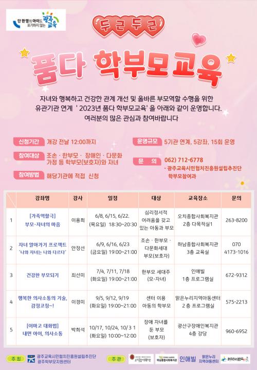 7ÀÏ ½Ã¹ÎÇùÄ¡ÁøÈï¿ø¼³¸³ÃßÁø´Ü¿¡ µû¸£¸é À̹ø Çкθð±³À°Àº ¡®¿ÀÄ¡Á¾ÇÕ»çȸº¹Áö°ü¡¯À» Æ÷ÇÔÇÑ 5°³ ±â°ü°ú ¿¬°èÇØ ÁøÇàµÈ´Ù. ÇâÈÄ ÀÚ³àÀÇ ÇູÇÑ Çб³»ýȰÀ» À§ÇÑ ¿Ã¹Ù¸¥ ºÎ¸ð¿ªÇÒ ¼öÇà°ú ÀÚÁ¸°¨ Çâ»ó, °¡Á·°ü°è °³¼± µîÀÇ ´Ù¾çÇÑ ÇÁ·Î±×·¥ÀÌ ÀÌ·ïÁø´Ù.