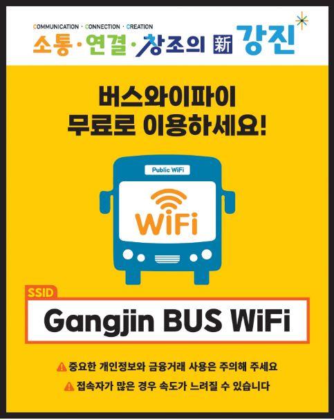 ³ó¾îÃ̹ö½º ¾È¿¡¼ ž½Â°´ ´©±¸³ª ½º¸¶Æ®Æù ¼³Á¤¿¡¼ ¡®Gangjin BUS WIFI¡¯¸¦ ¼±ÅÃÇϸé Åë½Å»ç¿Í °ü°è¾øÀÌ ÈÞ´ëÆù, ÅÂºí¸´, ³ëÆ®ºÏ µî ¸ðµç ±â±â¿¡¼ ¹«·á·Î ÀÎÅÍ³Ý »ç¿ëÀÌ °¡´ÉÇÏ´Ù.