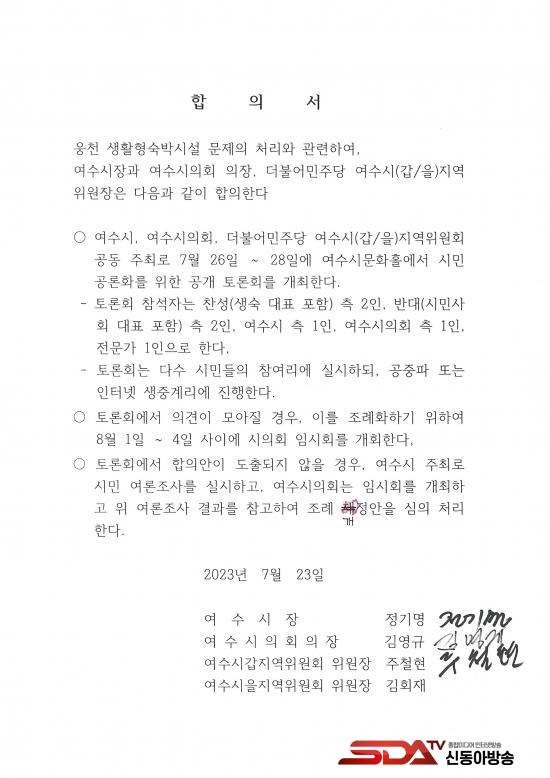 À̳¯ 3ÀÚ ¸¸³²À» ÅëÇØ ¡ã¿©¼ö½Ã¡¤¿©¼ö½ÃÀÇȸ¡¤´õºÒ¾î¹ÎÁÖ´ç ¿©¼ö½Ã°©Áö¿ªÀ§¿øÈ¸ °øµ¿ÁÖÃÖ·Î 7¿ù26ÀÏ~28ÀÏ¿¡ ¿©¼ö½Ã¹®ÈȦ¿¡¼ ½Ã¹ÎÅä·Ðȸ¸¦ °³ÃÖÇϱâ·Î ÇÏ°í ¡ãÅä·Ðȸ Âü¼®ÀÚ´Â Âù¼º(»ý¼÷ ´ëÇ¥ Æ÷ÇÔ) 2ÀÎ, ¹Ý´ë(½Ã¹Î´Üü ´ëÇ¥ Æ÷ÇÔ) 2ÀÎ, ¿©¼ö½Ã 1ÀÎ, ¿©¼ö½ÃÀÇȸ 1ÀÎ, Àü¹®°¡ 1ÀÎÀ¸·Î ÇÏ¸ç ¡ãÅä·Ðȸ ´Ù¼ö ½Ã¹ÎÂü¿©¿Í °øÁᒎ ¹× ÀÎÅÍ³Ý »ýÁ߰踦 ÁøÇàÇÏ°í ¡ãÅä·Ðȸ¿¡¼ ÇÕÀǰ¡ µÉ °æ¿ì, À̸¦ Á¶·ÊÈÇϱâ À§ÇØ 8¿ù1ÀÏ~4ÀÏ »çÀÌ¿¡ ¿©¼ö½ÃÀÇȸ ¿øÆ÷ÀÎÆ® ÀÓ½Ãȸ °³ÃÖÇÏ¸ç ¡ãÅä·Ðȸ¿¡¼ ÇÕÀǾÈÀÌ µµÃâµÇÁö ¾ÊÀ» °æ¿ì, ¿©¼ö½Ã ÁÖÃÖ·Î ¿©·ÐÁ¶»ç¸¦ ½Ç½ÃÇϰí, ¿©¼ö½ÃÀÇȸ´Â ÀÓ½Ãȸ¸¦ °³ÃÖÇØ À§ ¿©·ÐÁ¶»ç °á°ú¸¦ Âü°íÇØ Á¶·Ê °³Á¤¾ÈÀ» ½ÉÀÇ Ã³¸®Çϱâ·Î ÇÕÀÇÇß´Ù.