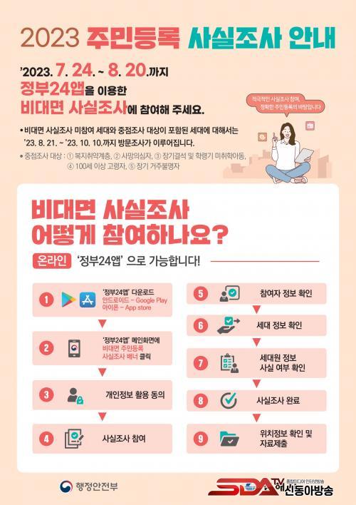 2023³â Áֹεî·Ï »ç½ÇÁ¶»ç´Â Áö³ 17ÀϺÎÅÍ ¿À´Â 11¿ù 10ÀϱîÁö ÀÌ·ïÁö¸ç ºñ´ë¸é µðÁöÅÐ Á¶»ç(7.24¡8.20)¿Í ÀÌ¡¤ÅëÀå, À¾¡¤¸é¡¤µ¿ °ø¹«¿øÀÌ °ÅÁÖÁö¸¦ ¹æ¹®ÇØ È®ÀÎ(8.21¡10.10)ÇÏ´Â ¹æ½ÄÀ¸·Î ÁøÇàµÈ´Ù. »ç½ÇÁ¶»ç °á°ú Áֹεî·Ï»çÇ×À» °íÄ¥ Çʿ䰡 ÀÖÀ» °æ¿ì Áö¹æÀÚÄ¡´Üü°¡ ÃÖ°í¡¤°ø°í ÀýÂ÷¸¦ °ÅÃÄ Á÷±ÇÀ¸·Î ¼öÁ¤ÇÑ´Ù.