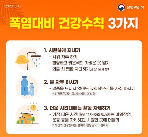 ¿Â¿ÁúȯÀ» ¿¹¹æÇϱâ À§Çؼ´Â Æø¿°ÀÌ ¿¹°íµÈ °æ¿ì ³· ½Ã°£´ë(12-17½Ã)¿¡´Â Ȱµ¿À» ÀÚÁ¦ÇÏ°í ½Ã¿øÇÑ °÷¿¡ ¸Ó¹°·¯¾ß Çϸç, °¥ÁõÀ» ´À³¢Áö ¾Ê¾Æµµ ±ÔÄ¢ÀûÀ¸·Î ¹°À» ÀÚÁÖ ¸¶¼Å¾ßÇÑ´Ù. ¿ÜÃ⠽ÿ¡´Â ¸ðÀÚ³ª ¾ç»ê, ¹à°í Çæ··ÇÑ ¿ÊÀ» ÀÔÀ¸¸é ¿¹¹æ¿¡ µµ¿òÀÌ µÉ ¼ö ÀÖ´Ù.