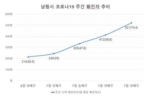 ÃÖ±Ù ³²¿ø½Ã Äڷγª19 ¹ß»ý»óȲÀº Áö³ 6¿ù ³Ý°ÁÖ 214°Ç¿¡¼ 7¿ù ³Ý°ÁÖ 521°Ç ¹ß»ýÀ¸·Î ÇÑ ´Þ »çÀÌ 2¹è ÀÌ»ó È®ÁøÀÚ°¡ °¡ÆÄ¸£°Ô Áõ°¡Çß´Ù.