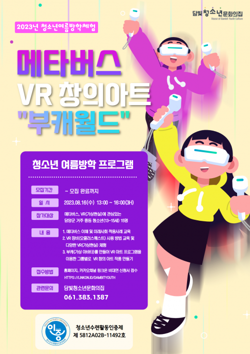 ¡®ºÎij¿ùµå¡¯´Â ¿©¸§¹æÇÐÀ» ¸ÂÀÌÇØ 4Â÷ »ê¾÷±â¼úÀÎ VR(°¡»óÇö½Ç)À» ÀÌ¿ëÇÑ ¿¹¼úÀÛǰÀ» ¸¸µå´Â ÇÁ·Î±×·¥À¸·Î ¿À´Â 8¿ù 9ÀÏ, 8¿ù 16ÀÏ ÃÑ 2ȸ±â·Î ÁøÇàµÇ¸ç Âü¿© û¼Ò³âÀº ´ãºûû¼Ò³â¹®ÈÀÇÁý ȨÆäÀÌÁö, īī¿Àä³Î¿¡¼ ºñ´ë¸éÀ¸·Î ¸ðÁýÇÒ ¿¹Á¤ÀÌ´Ù.