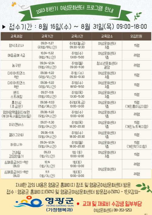 ¸ðÁý ÀοøÀº ÃÑ 235¸íÀ¸·Î 1ÀÎ 2°úÁ¤ À̳» °úÁ¤º° ¼±Âø¼ø(¿©¼º¹®È¼¾ÅÍ ¹æ¹® ¹× ȨÆäÀÌÁö Á¢¼ö)À¸·Î ¸ðÁýµÇ¸ç ¼ö°½ÅûÀº ¿µ±¤±º¿¡ ÁÖ¼Ò¸¦ µÎ°í °ÅÁÖÇÏ´Â ¿©¼ºÀÌ¸é ´©±¸³ª °¡´ÉÇϰí, ¿©¼º¹®È¼¾ÅÍ ¹æ¹® ¹× ¿µ±¤±º ȨÆäÀÌÁö¿¡ ½ÅûÇÏ¸é µÈ´Ù.