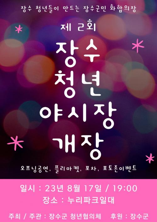 Á¦2ȸ Àå¼ö û³â ¾ß½ÃÀå¿¡¼´Â Áö¿ª ÁֹΠ°ø¿¬, Çø®¸¶ÄÏ, üÇèºÎ½º, Æ÷Â÷ µîÀÌ ¿î¿µµÇ¸ç, ±º¹Î ´©±¸³ª ÀÚÀ¯·Ó°Ô Âü¿©ÇÒ ¼ö ÀÖ´Ù.