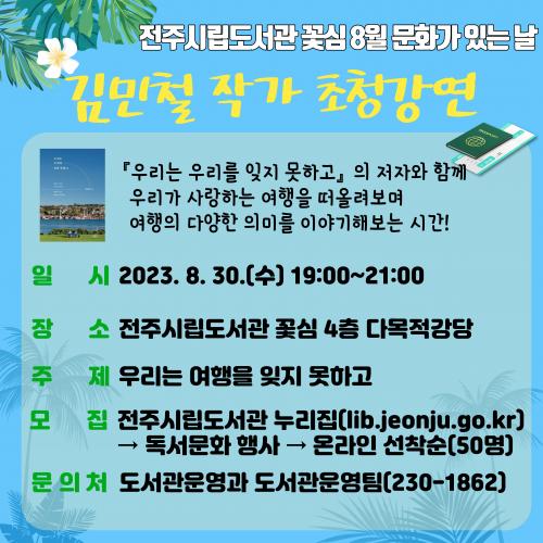 À̳¯ °¿¬¿¡¼ ±è¹Îö ÀÛ°¡´Â ¡®¿ì¸®´Â ¿©ÇàÀ» ÀØÁö ¸øÇÏ°í¡¯¸¦ ÁÖÁ¦·Î Âü¿©ÇÑ ½Ã¹Îµé°ú ÇÔ²² ¿©ÇàÀÇ ´Ù¾çÇÑ Àǹ̸¦ À̾߱âÇØº¸´Â ½Ã°£À» °¡Áú ¿¹Á¤ÀÌ´Ù.