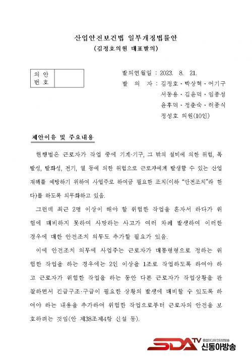 ±èÁ¤È£ ÀÇ¿øÀº ¡°»ç¶÷ÀÇ »ý¸íº¸´Ù ¼ÒÁßÇÑ °Ô ¾ø±â ¶§¹®¿¡ ¸ñ¼ûÀÌ À§ÅÂ·Î¿ï ¼ö ÀÖ´Â À§ÇèÇÑ ÀÛ¾÷À» Ȧ·Î Çϵµ·Ï ÇØ¼´Â ¾È µÈ´Ù¡±¸ç À§ÇèÀÛ¾÷ 2ÀÎ 1Á¶ ¹ýÁ¦È¸¦ ÅëÇØ ÀÏÅÍ¿¡¼ ´õ ÀÌ»ó Á×Áö ¾Ê°í ÀÏÇÒ ¼ö ÀÖµµ·Ï ÇØ¾ß ÇÑ´Ù°í ¹àÇû´Ù.