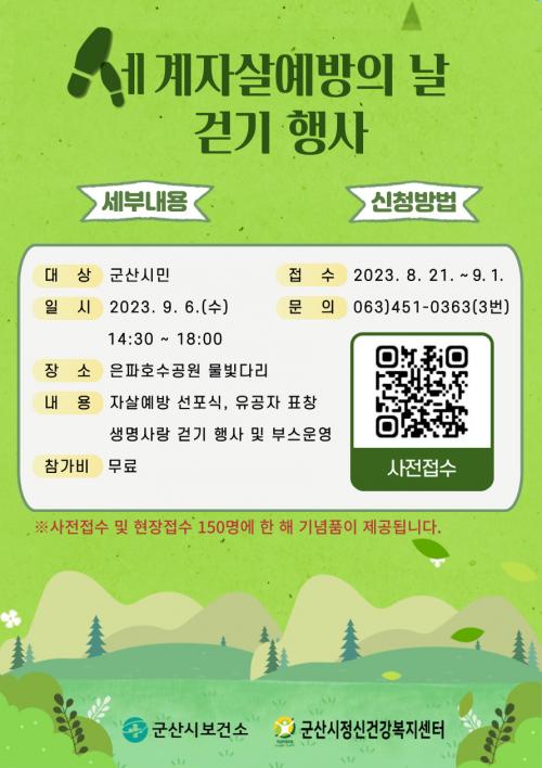 ±º»ê½Ã¹ÎÀÇ »ý¸íÁ¸Áß ¹®È Á¶¼ºÀ» À§ÇØ ÁøÇàÇϴ¡¸¼¼°èÀڻ쿹¹æÀÇ ³¯ ±â³ä °È±â Çà»ç¡¹´Â ÀºÆÄÈ£¼ö°ø¿ø ¹°ºû´Ù¸®¿¡¼ Ãâ¹ßÇØ µÑ·¹±æ ÃÑ 4.86kmÀÇ ÄÚ½º·Î, ¿ÀÈÄ 3½Ã ¹ÝºÎÅÍ ¾à 1½Ã°£ 20ºÐ µ¿¾È ÁøÇàµÈ´Ù. À̳¯ Çà»ç¿¡¼´Â °È±â Çà»ç»Ó¸¸ ¾Æ´Ï¶ó »ý¸í »ç¶û ¼±Æ÷½Ä, À¯°øÀÚ ½Ã»ó, °ü·Ã ±â°ü È«º¸ºÎ½ºµµ ¿î¿µÇÒ ¿¹Á¤ÀÌ´Ù.