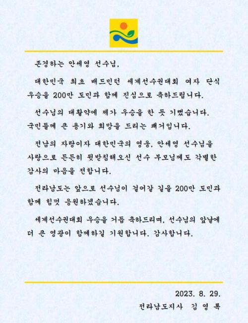 ±è¿µ·Ï Áö»ç´Â ¡°´ëÇѹα¹ ÃÖÃÊ ¹èµå¹ÎÅÏ ¼¼°è¼±¼ö±Ç´ëȸ ¿©ÀÚ ´Ü½Ä ¿ì½ÂÀ» 200¸¸ Àü³²µµ¹Î°ú ÇÔ²² Áø½ÉÀ¸·Î ÃàÇϵ帰´Ù¡±¸ç ¡°Àü³²ÀÇ ÀÚ¶ûÀ» ³Ñ¾î ´ëÇѹα¹ÀÇ ¿µ¿õÀ¸·Î Ű¿öÁֽŠ¾È¼¼¿µ ¼±¼öÀÇ ºÎ¸ð´Ô²²µµ °¨»çÇÏ´Ù¡±°í ÃàÇÏ Àλ縦 ÀüÇß´Ù.