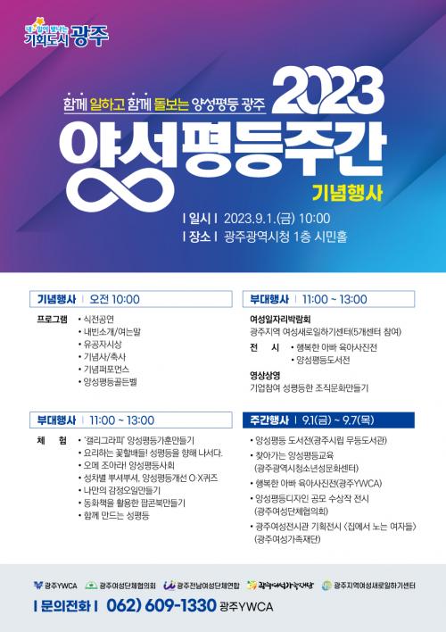 ±â³äÇà»ç´Â ±¤ÁÖYWCA¡¤±¤ÁÖ¿©¼º´ÜüÇùÀÇȸ¡¤±¤ÁÖÀü³²¿©¼º´Üü¿¬ÇÕÀÌ °øµ¿ Âü¿©ÇØ ¡®ÇÔ²² ÀÏÇϰí ÇÔ²² µ¹º¸´Â ¾ç¼ºÆòµî ±¤ÁÖ¡¯¶ó´Â ÁÖÁ¦·Î ¾ç¼ºÆòµî ¹®È È®»ê ¹× Áö¿ª¿©¼º°èÀÇ ´ÜÇÕ°ú »ó»ýÀÇ ±æÀ» ¸ð»öÇÑ´Ù.