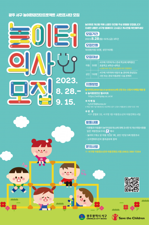 ½Ã¹ÎÁ¶»ç´Ü¡®³îÀÌÅÍ Àǻ硯´Â 9¿ù 23ÀÏ »çÀü±³À°À» ½ÃÀÛÀ¸·Î ¼±¸ °ü³» ¾î¸°À̳îÀÌÅÍ 55°³¼Ò¸¦ ¹æ¹®¡¤Á¶»çÇÑ´Ù. ³îÀÌÅÍ 1°³¼Ò ´ç ¾Æµ¿Àº 1ȸ, ¼ºÀÎÀº 5ȸ ¹æ¹®ÇØ ³îÀÌÅÍÀÇ Á¢±Ù¼º, ȯ°æÇöȲ, ³îÀ̱ⱸ ÇöȲ, ³îÀ̼º µîÀ» Á¶»çÇÏ°í °³¼± ¹× Èñ¸Á»çÇ×À» ´ãÀº ó¹æÀü(¿ä±¸¼)À» Á¦½ÃÇÒ ¿¹Á¤ÀÌ´Ù.