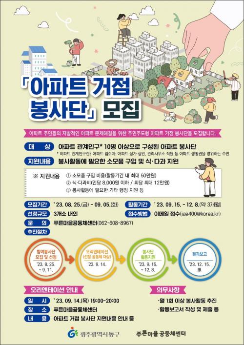 µ¿±¸´Â ¡®¾ÆÆÄÆ® °ÅÁ¡ ºÀ»ç´Ü¡¯À» ¾ÆÆÄÆ® ÀÔÁÖ¹ÎÀ¸·Î ÇÑÁ¤ÇÏÁö ¾Ê°í °¢°è°¢ÃþÀÇ Áֹεé·Î ±¸¼ºÇÔ¿¡ µû¶ó ³»½ÇÀÖ´Â ºÀ»çȰµ¿À» ±â´ëÇϰí ÀÖ´Ù. ¶ÇÇÑ Áö¼Ó °¡´ÉÇÑ ¹ßÀüÀ» À§ÇØ µ¿±¸ÀÚ¿øºÀ»ç¼¾ÅÍ¿Í Çù¾÷ÇØ °ü·Ã ±âÃʱ³À°(¿À¸®¿£Å×À̼Ç)À» ÃßÁøÇÏ´Â µî ü°èÀûÀ¸·Î ¿î¿µ¡¤°ü¸®ÇÒ ¿¹Á¤ÀÌ´Ù.
