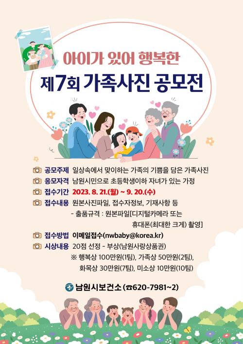 2017³âºÎÅÍ ½ÃÀÛÇØ ¿ÃÇØ·Î 7ȸ°¸¦ ¸Â´Â °¡Á·»çÁø °ø¸ðÀü¿¡´Â ³²¿ø½Ã¹ÎÀ¸·Î ÃʵîÇлý ÀÌÇÏ Àڳడ ÀÖ´Â °¡Á¤ÀÌ¸é ´©±¸³ª ÀÀ¸ðÇÒ ¼ö ÀÖÀ¸¸ç, ¾ÆÀÌ¿Í ÇÔ²² ÇູÇß´ø ¼ø°£À» ´ãÀº °¡Á·»çÁø ¿øº»°ú ÇÔ²² ÀÛǰ Á¦¸ñ, ÃÔ¿µÀå¼Ò, ÃÔ¿µÀÏ, °£·«ÇÑ »çÁø ¼³¸í°ú Á¢¼öÀÚ Á¤º¸¸¦ ½Ã º¸°Ç¼Ò À̸ÞÀÏ·Î Á¢¼öÇÏ¸é µÈ´Ù. (°¡Á¤´ç ÃÖ´ë 2Á¡ ÀÀ¸ð °¡´É)