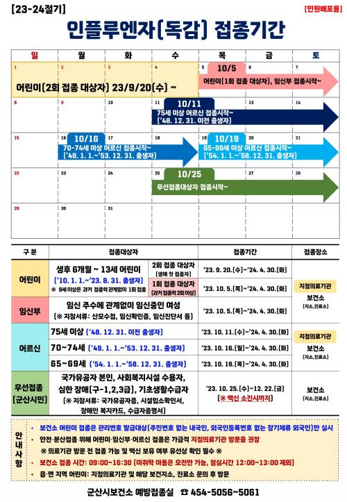 Á¢Á¾ ´ë»óÀº 65¼¼ ÀÌ»ó ¾î¸£½Å(1958. 12. 31. ÀÌÀü Ãâ»ýÀÚ)À̸ç, ¾ÈÀüÇÑ ¿¹¹æÁ¢Á¾ ½ÃÇàÀ» À§ÇØ ¿¬·É´ë¸¦ ±¸ºÐÇØ ½Ç½ÃÇÑ´Ù. 75¼¼ ÀÌ»óÀº 10¿ù 11ÀϺÎÅÍ, 70~74¼¼´Â 10¿ù 16ÀϺÎÅÍ, 65~69¼¼´Â 10¿ù 19ÀϺÎÅÍ ÁÖ¼ÒÁö °ü°è¾øÀÌ Àü±¹ ÁöÁ¤ À§Å¹ÀÇ·á±â°ü¿¡¼­ ¹«·á·Î Á¢Á¾ÇÒ ¼ö ÀÖ´Ù.