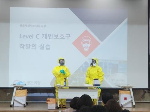 Ãʵ¿´ëÀÀ¿ä¿øµéÀº »ý¹°Å×·¯ °¨¿°º´ÀÇ ÀÌÇØ ¹× ´ëÀÀü°è ±³À°À» ¹ÞÀº ÈÄ °³Àκ¸È£±¸ Âø¡¤Å»ÀÇ ½Ç½À°ú ´ÙÁߎÁöŰƮ °Ë»ç ½ÃÇà ¹× °Ëü À̼ÛÀ» ¼öÇàÇßÀ¸¸ç, »ý¹°Å×·¯ ÀǽɻóȲ ¹ß»ý ½Ã ½Å¼ÓÇÏ°Ô ÇöÀå¿¡ Ã⵿ÇÒ ¼ö ÀÖ´Â ¿ª·®°­È­ ÈÆ·ÃÀ» ½Ç½ÃÇß´Ù.