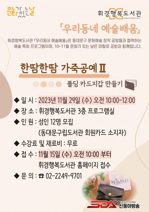 ¿¹¼ú Ư¼ºÈ µµ¼°üÀÎ ÈÖ°æÇູµµ¼°üÀº °ÇÃà¿¡¼ ´Ù·ç´Â °ø°£ÀÇ °³³ä°ú ¿ì¸®³ª¶óÀÇ °ÇÃà Æ®·»µå¸¦ ¿¹¼úÀû ½Ã°¢¿¡¼ ÀÌÇØÇØº¸´Â ÇÁ·Î±×·¥ÀÎ ¡®ºñ¿ò°ú »çÀÌ, °ø°£¿¡ ´ëÇÏ¿©¡¯¸¦ ¿î¿µÇÑ´Ù. ÃÊµî °íÇгâÀ» ´ë»óÀ¸·Î´Â ÁÖº¯ ȯ°æ¿¡¼ À̾߱⸦ ã°í ÀÎÇüÀ» ¸¸µé¾î ¿µÈ¸¦ Á¦ÀÛÇÏ´Â ¡®¸»ÇÏ´Â ÀÎÇü, ²ÞƲ°Å¸®´Â À̾߱⡯¸¦ ¿î¿µÇÒ ¿¹Á¤À̸ç, ¹®È°¡ ÀÖ´Â ³¯ÀÎ 29ÀÏ(¼ö)¿¡´Â µ¿´ë¹®±¸ Á¦±âµ¿¿¡ ÀÖ´Â ¸¶ÇÒ·Î °¡Á×°ø¹æ°ú ¿¬°èÇÏ¿© °¡Á× Ä«µå Áö°© ¸¸µé±â °ø¿¹ ÇÁ·Î±×·¥µµ ÁøÇàÇÒ ¿¹Á¤ÀÌ´Ù.