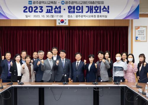 1ÀÏ ½Ã±³À°Ã»¿¡ µû¸£¸é ÀÌÁ¤¼± ±³À°°¨°ú ±è´öÁø ±¤ÁÖ±³ÃÑȸÀå µî °ü°èÀÚµéÀÌ Âü¼®ÇÑ °¡¿îµ¥ º»Ã» ÁßȸÀǽǿ¡¼ ¡®2023 ±³¼·¡¤ÇùÀÇ °³È¸½Ä¡¯À» °¡Á³´Ù.