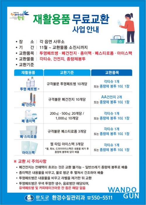 ¡®ÀçȰ¿ëǰ ¹«·á ±³È¯¡¯Àº °¡Á¤¿¡¼ ¹ö·ÁÁö´Â ÀçȰ¿ëǰÀ» °¡±î¿î À¾¸é»ç¹«¼Ò·Î °¡Á®°¡¸é Åõ¸í ÆäÆ®º´ 10°³, Æó Á¾ÀÌ ÆÑ 1000§¢ ±âÁØ 10°³, Æó½ºÆ¼·ÎÆû 3°³, ¾ÆÀ̽ºÆÑ 3°³¸¦ °¢ Ƽ½´³ª Á¾·®Á¦ ºÀÅõ·Î, Æó°ÇÀüÁö 10°³¸¦ »õ °ÇÀüÁö ¶Ç´Â Á¾·®Á¦ ºÀÅõ·Î ±³È¯ÇØ ÁØ´Ù.