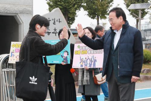 ¼°Å¼® ±³À°°¨Àº À̳¯ ¿ÀÀü 7½Ã 30ºÐºÎÅÍ 30¿© ºÐ°£ ÀüÁÖ Àü¶ó°íµîÇб³ ¾Õ¿¡¼ ½ÃÇèÀ» Ä¡¸£±â À§ÇØ Çб³ ¾ÈÀ¸·Î µé¾î°¡´Â ¼öÇè»ýµéÀ» ¸ÂÀÌÇÏ¸ç ¡°¸¶Áö¸·±îÁö ÃÖ¼±À» ´ÙÇØ´Þ¶ó¡±°í ÀÀ¿øÇß´Ù.