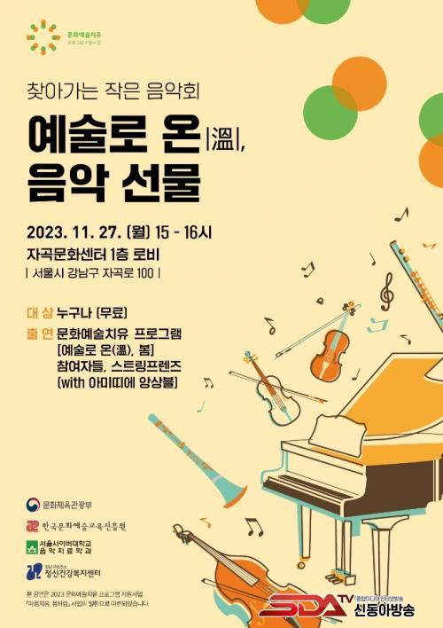 11¿ù 27ÀÏ 15½Ã~16½Ã ¼¾ÅÍ 1Ãþ ·Îºñ¿¡¼ ÀÛÀº À½¾Çȸ ¡®¿¹¼ú·Î ¿Â(è®) À½¾Ç¼±¹°¡¯À» ¿¬´Ù. ÀÌ À½¾Çȸ´Â Á߳⿩¼º ¿ì¿ï¿¹¹æ ÇÁ·Î±×·¥ Âü°¡ÀÚµéÀÌ ¼¿ï»çÀ̹ö´ëÇб³ À½¾ÇÄ¡·áÇаú Ŭ·¡½Ä Àü¹® ¿¬ÁÖÀÚµé°ú ÇÔ²² ²Ù¹Ì´Â ¹«´ë´Ù. 9¿ùºÎÅÍ ¸ÅÁÖ ¿ù¿äÀÏ 12ÁÖ°£ ÁøÇàÇÑ ÇÁ·Î±×·¥¿¡¼ Âü°¡ÀÚµéÀº ÀÚ½ÅÀÇ °¨Á¤À» À½¾Ç°ú ¾Ç±â·Î Ç¥ÇöÇÏ¸é¼ ¸¶À½À» ȸº¹Çϰí, ¼ö¾÷À» ¸¶¹«¸®ÇÏ¸ç ±×µ¿¾È ¿¬½ÀÇÑ Ä®¸²¹Ù¡¤Çڵ座 µîÀÇ ¾Ç±â ¿¬ÁÖ ½Ç·ÂÀ» ¼±º¸ÀδÙ.