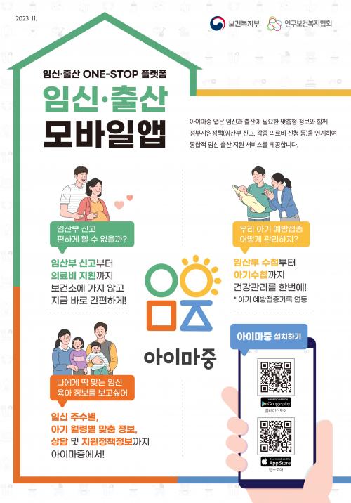 ÈÞ´ëÆù(Ç÷¹À̽ºÅä¾î, ¾Û½ºÅä¾î)¿¡ ¼³Ä¡ÇÑ ¡®¾ÆÀ̸¶Áß¡¯ ¾Û¿¡¼´Â ÀÓ»êºÎ ½Å°í(¿ì¿ïÁõ ÀÚ°¡°Ë»çµµ °¡´É)¸¦ ºñ·ÔÇØ ÀÇ·áºñ Áö¿ø°ú ÀÓ»êºÎ ¼öø(Á¤±âÁøÂû ¡¤ ÀӽŠÁß °Ë»ç ¡¤ ¾Æ±â¿¡°Ô ÇÒ ¸», ¾ö¸¶ ¡¤ ÅÂ¾Æ º¯È º¸±â), ¾Æ±â ¼öø(¼ºÀå±â·Ï ¡¤ ÀÇ·á±â°ü ¹æ¹® ¡¤ °Ç°°ËÁø, ¾Æ±â º¯È º¸±â ¡¤ ¾Æ±â ¿¹¹æÁ¢Á¾ Á¶È¸). ±×¸®°í ´Ù¾çÇÑ Áö¿øÁ¤Ã¥Á¤º¸(Ãâ»êÀå·Á±Ý µî ÀӽŰú Ãâ»ê¿¡ ÇÊ¿äÇÑ Á¤º¸)¸¦ ¾òÀ» ¼ö ÀÖ´Ù.