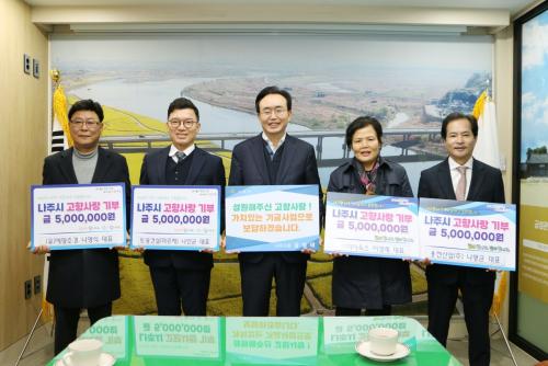 [½Åµ¿¾Æ¹æ¼Û=±èÀçÂù±âÀÚ] Àü³² ³ªÁÖ½Ã(½ÃÀå À±º´ÅÂ)´Â ¹Ý³²¸é Çâ¿ìÀÎ ¿ëõ»ê¾÷(ÁÖ) ³ª¸í±Õ ´ëÇ¥, Å䱤°Ç¼³(¹Ì¸£Ã¤) ³ª¾È±Õ ´ëÇ¥, (À¯)¿¹ÇâÁ¶°æ ³ª¿µ½Ä ´ëÇ¥, ¢ßÇÏÀÌ¿Á½º ÀÌ¿µ·Ê ´ëÇ¥°¡ °íÇâ»ç¶û±âºÎÁ¦ ÃÖ°í Çѵµ ±Ý¾×ÀÎ 500¸¸ ¿øÀ» °¢°¢ ±âŹÇß´Ù°í 1ÀÏ ¹àÇû´Ù.