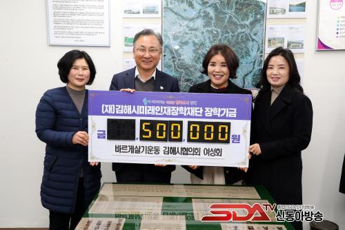 [½Åµ¿¾Æ¹æ¼Û´º½º=±èÁÖ¿¬±âÀÚ] ±èÇØ½Ã¹Ì·¡ÀÎÀçÀåÇÐÀç´Ü(ÀÌ»çÀå ÇöÁ¾¿ø)Àº 3ÀÏ ¹Ù¸£°Ô»ì±â¿îµ¿ ±èÇØ½ÃÇùÀÇȸ ¿©¼ºÈ¸(ȸÀå ¾çÇý·Ã)¿¡¼­ ÀåÇбâ±Ý 50¸¸¿øÀ» ±âŹÇß´Ù°í ¹àÇû´Ù.