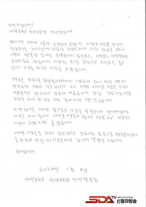 ÀåÀ¯2µ¿ ÇàÁ¤º¹Áö¼¾ÅÍ ±èÀç¿ë µ¿ÀåÀº ¡°Àû±ØÀûÀ¸·Î ³ª´® Ȱµ¿À» ÅëÇØ ÀÌ¿ô»ç¶ûÀ» ÀüÇØÁÖ´Â ´ëûÁßÇб³ °ü°èÀÚ ¹× Çлýµé ¸ðµÎ¿¡°Ô ±íÀÌ °¨»çµå¸°´Ù.¡±¸é¼ ¡°´ëûÁßÇб³ÀÇ ¸¶À½ÀÌ ´ã±ä ¼º±ÝÀº µµ¿òÀÌ ÇÊ¿äÇÑ ¾î·Á¿î ÀÌ¿ôµé¿¡°Ô Àß Àü´ÞÇϵµ·Ï ÇϰڴÙ.¡±°í ¸»Çß´Ù.
