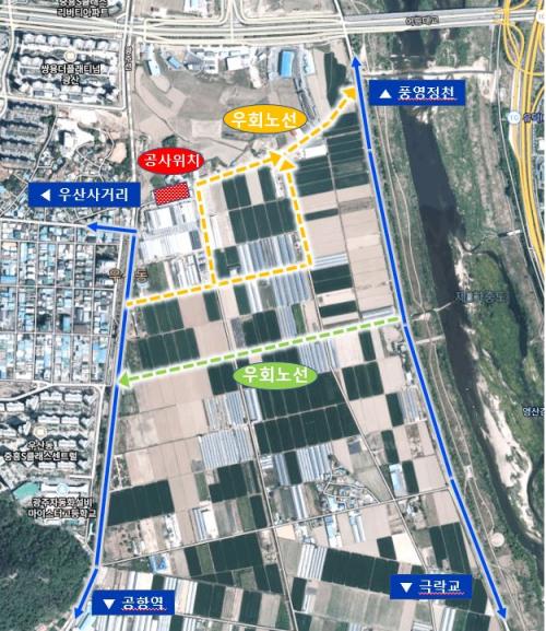 ÀÌ¿¡ µû¶ó ÇØ´ç ±¸°£ Â÷·® ÁøÀÔÀÌ ¾î·Á¿ö ¿ìÈ¸ÇØ¾ß ÇÑ´Ù. ±¤ÁÖ»ó¼öµµ»ç¾÷º»ºÎ´Â °ø»ç Á¾·á±îÁö Â÷·®½ÅÈ£¼ö¿Í ¾È³»°£ÆÇ µîÀ» ¹èÄ¡ÇØ ±³ÅëºÒÆí µîÀ» ÃÖ¼ÒÈÇÒ ¹æÄ§ÀÌ´Ù.