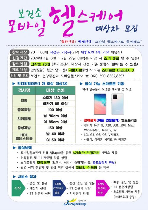 20~64¼¼ ÁÖ¹ÎÀ» ´ë»óÀ¸·Î Çϸç Ç÷¾Ð, Ç÷´ç, º¹ºÎºñ¸¸, Áß¼ºÁö¹æ µî °Ç° À§Çè¿äÀÎ °¡¿îµ¥ ÇÑ °¡Áö ÀÌ»óÀÇ Áõ»óÀÌ ÀÖ´Â ±º¹ÎÀ» ¿ì¼± ¼±Á¤ÇÑ´Ù. »ç¾÷ Âü¿© Àü º¸°Ç¼Ò¿¡ ¹æ¹®ÇØ Ç÷¾×, Ç÷¾Ð, üÁú·® °Ë»ç¿Í °Ç°»ó´ãÀ» ¹Þ¾Æ¾ß ÇÑ´Ù. ´Ü Ç÷¾Ð, ´ç´¢, °íÁöÇ÷Áõ µîÀ¸·Î º´¿ø Áø´ÜÀ» ¹Þ¾Ò°Å³ª ¾à¹°À» º¹¿ë ÁßÀÎ ÁÖ¹ÎÀº ½ÅûÇÒ ¼ö ¾ø´Ù.