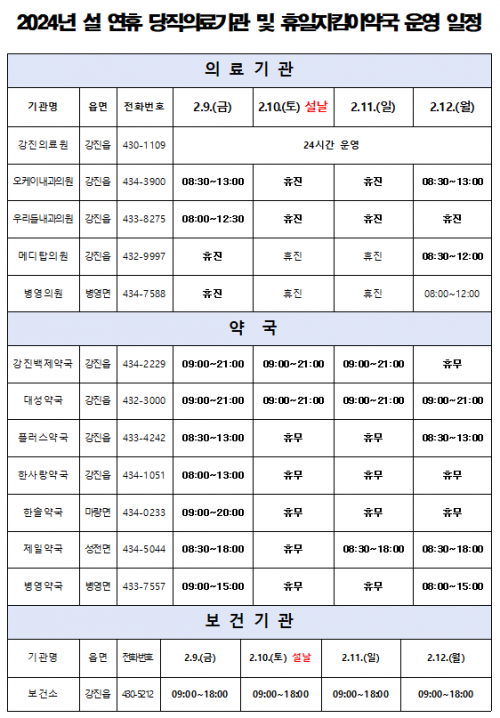 ÀÌ´Â ¼³¿¬ÈÞ ±â°£µ¿¾È Áø·á °ø¹éÀ» ¹æÁöÇÏ°í ±º¹ÎµéÀÇ ÀÇ·á ±â°ü ¹× ¾à±¹ À̿뿡 µû¸¥ ºÒÆíÀ» ÃÖ¼ÒÈÇϱâ À§ÇÑ °ÍÀ¸·Î, °ü³» Áö¿ªÀÀ±ÞÀÇ·á±â°üÀÎ Àü¶ó³²µµ °ÁøÀÇ·á¿øÀº 24½Ã°£ ÀÀ±ÞÁø·áü°è¸¦ À¯ÁöÇϸç, ´çÁ÷ÀÇ·á±â°ü 4°³¼Ò, ÈÞÀÏÁöÅ´À̾౹ 7°³¼Ò°¡ ¼³ ¿¬ÈÞ ±â°£ µ¿¾È ¿î¿µµÈ´Ù.