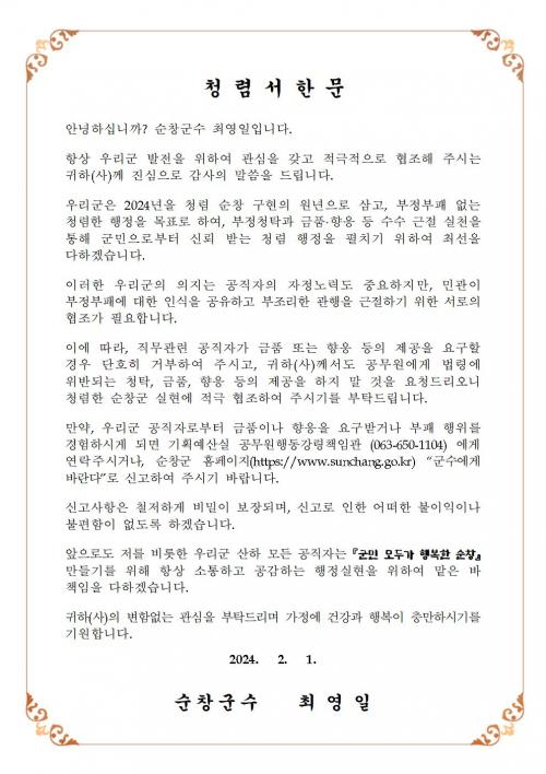 ¹ß¼ÛµÈ û·Å ¼Çѹ®Àº ±º¿¡¼ ¾÷¹« ó¸®ÇÑ °ø»ç¡¤¿ë¿ª¡¤¹°Ç°°è¾à, º¸Á¶±ÝÁö¿ø, À硤¼¼Á¤ ¹× ÀÎÇã°¡ µî Á÷¹« °ü·ÃÀÚ¸¦ ´ë»óÀ¸·Î ºÎÁ¤¡¤ºÎÆÐ¿¡ ´ëÇÑ ÀνÄÀ» °øÀ¯Çϰí, ¹ý·É¿¡ À§¹è µÇ´Â ûŹ, ±Ýǰ¡¤ÇâÀÀ¿¡ ´ëÇÑ ¿ä±¸¿Í Á¦°øÀ» ±ÙÀýÇÏÀÚ´Â ³»¿ëÀ» ´ã°í ÀÖ´Ù.