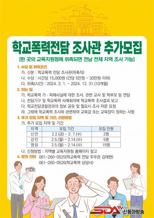 °Áø±³À°Áö¿øÃ»Àº 2¿ù 5ÀÏ(¿ù)ºÎÅÍ 14ÀÏ(¼ö)±îÁö 5¸íÀ» ¸ðÁýÇϰí, ¿µ¾Ï±³À°Áö¿øÃ»Àº °°Àº ±â°£ 15¸íÀ» ¸ðÁýÇÑ´Ù. ¶Ç, ½Å¾È±³À°Ã»Àº 2¿ù 2ÀÏ(±Ý)ºÎÅÍ 7ÀÏ(¼ö)±îÁö 2¸íÀ» ¸ðÁýÇÑ´Ù. À§ÃËµÈ Çб³Æø·ÂÀü´ãÁ¶»ç°üÀº Àü³² Àü Áö¿ª¿¡¼ Ȱµ¿ÀÌ °¡´ÉÇÏ´Ù.